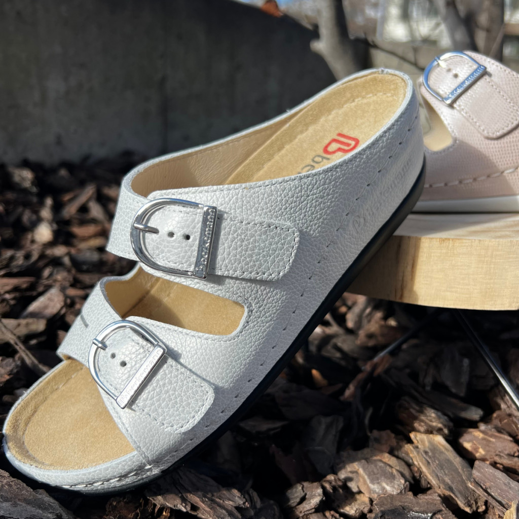Minőségi bőr alapanyagokból készült, öt ponton alátámasztott, finoman párnázott anatómiai talpbetéttel rendelkező női papucs.
